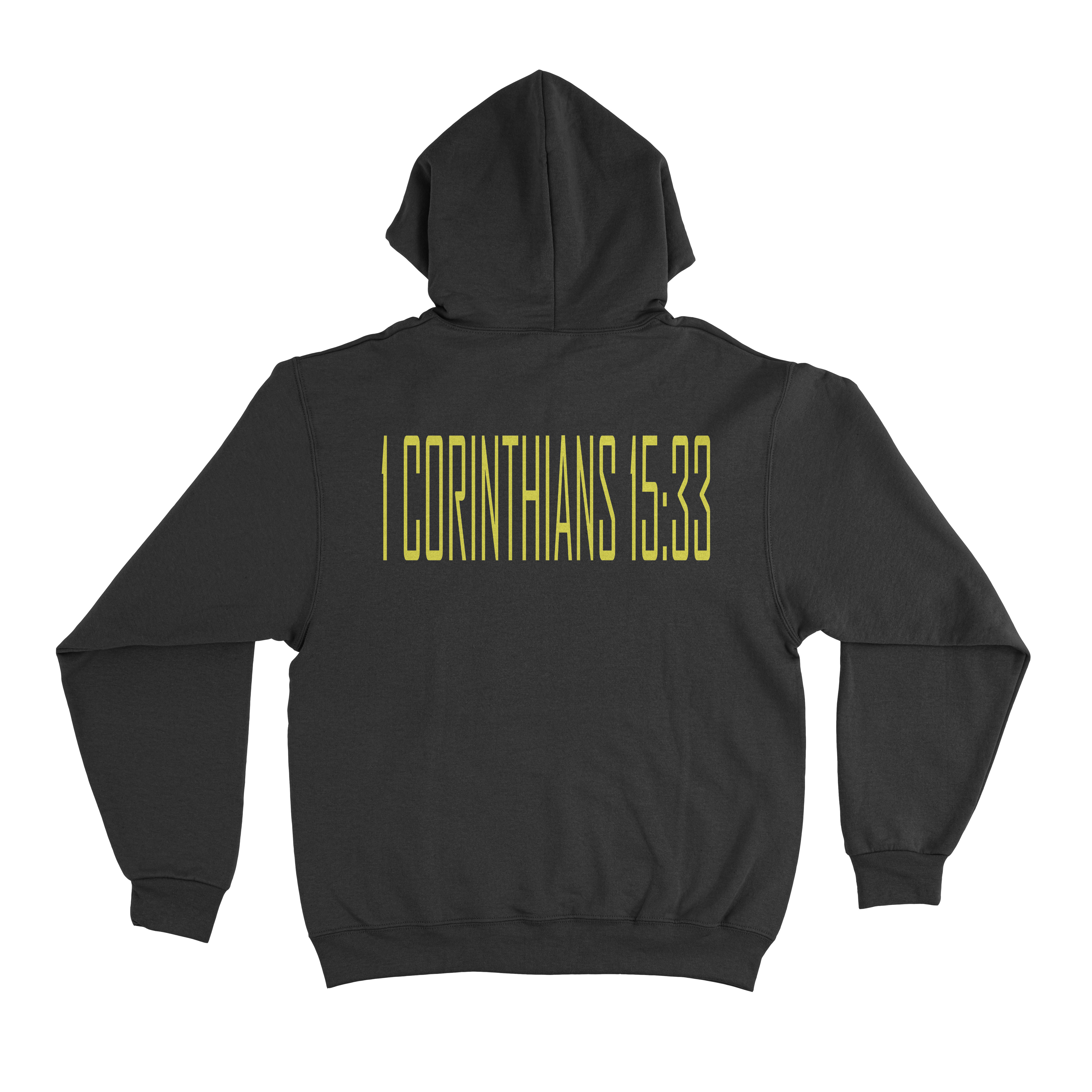 100% Cotton material Hoodie with Scripture design center chest placement, with 1 Cor 15:33 on the back.