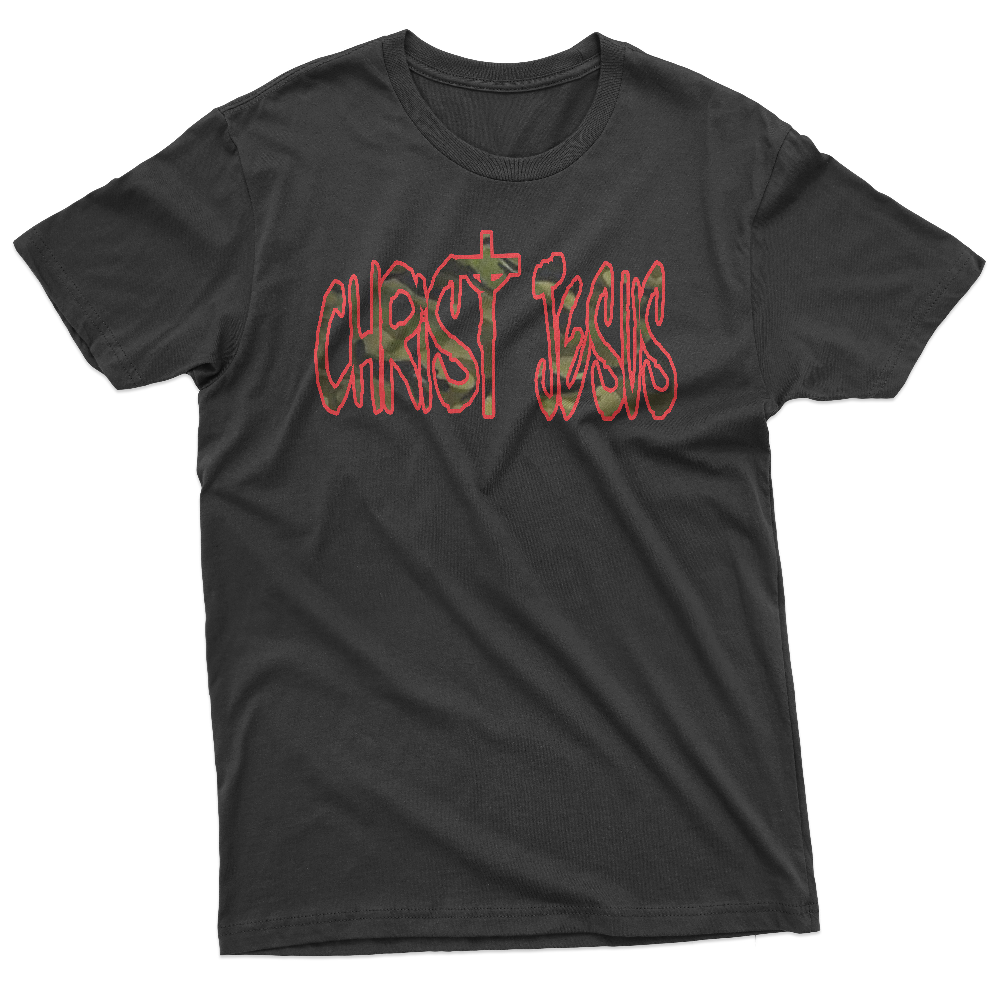 50/50 Cotton Poly blend material with a Camo Christ Jesus design center chest placement, with a white cross on the back.