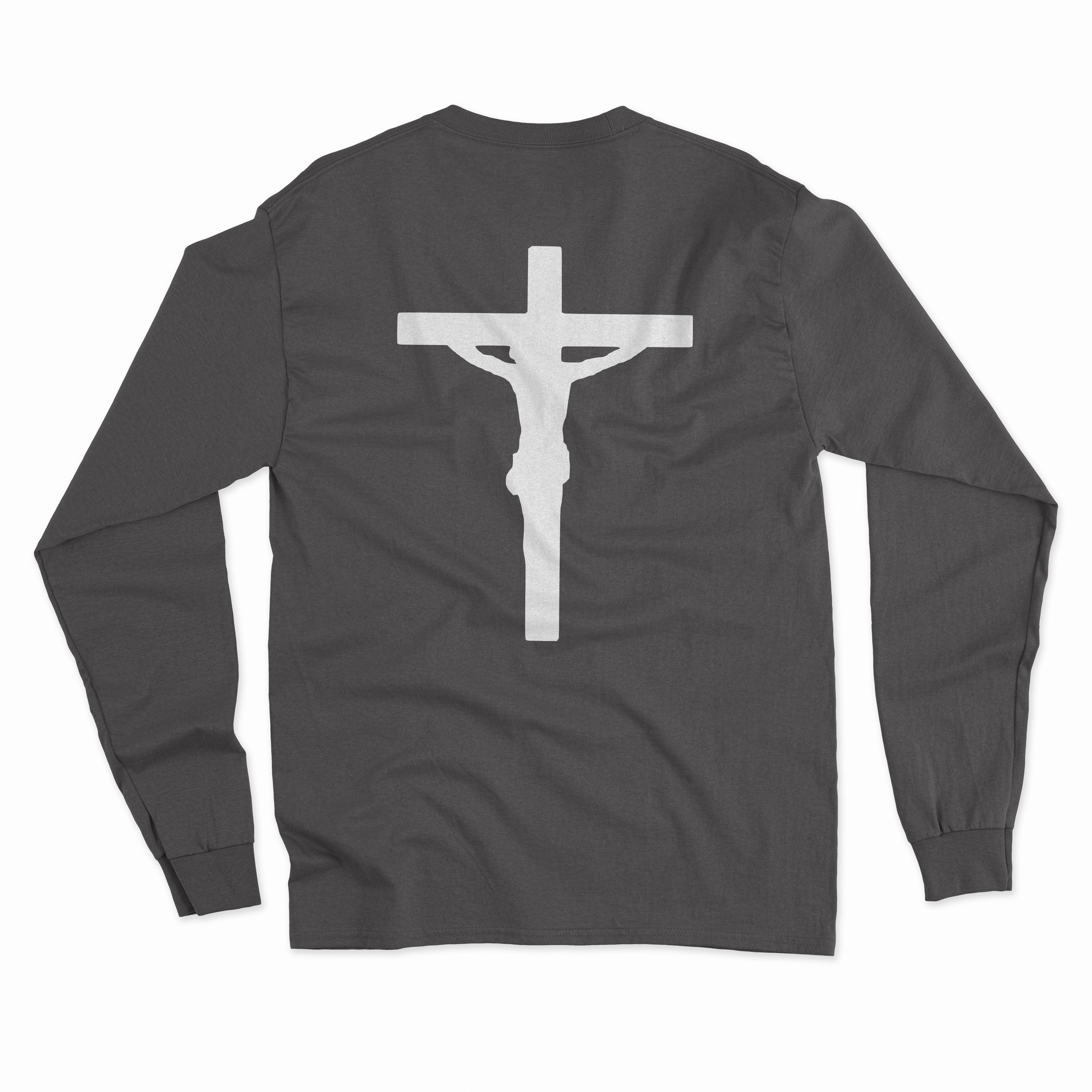 50/50 Cotton Poly blend material with a White Christ Jesus design center chest placement, with a white cross on the back.