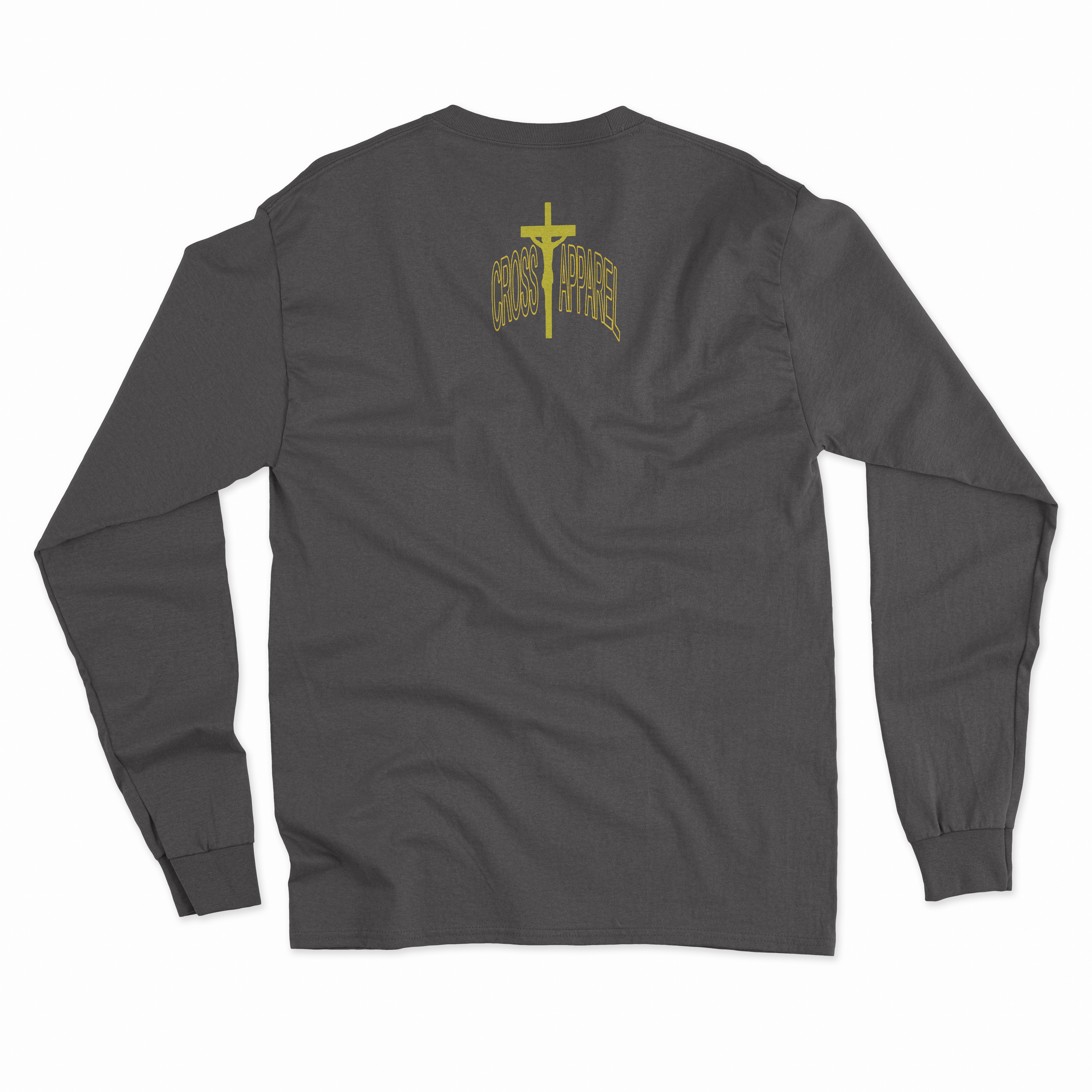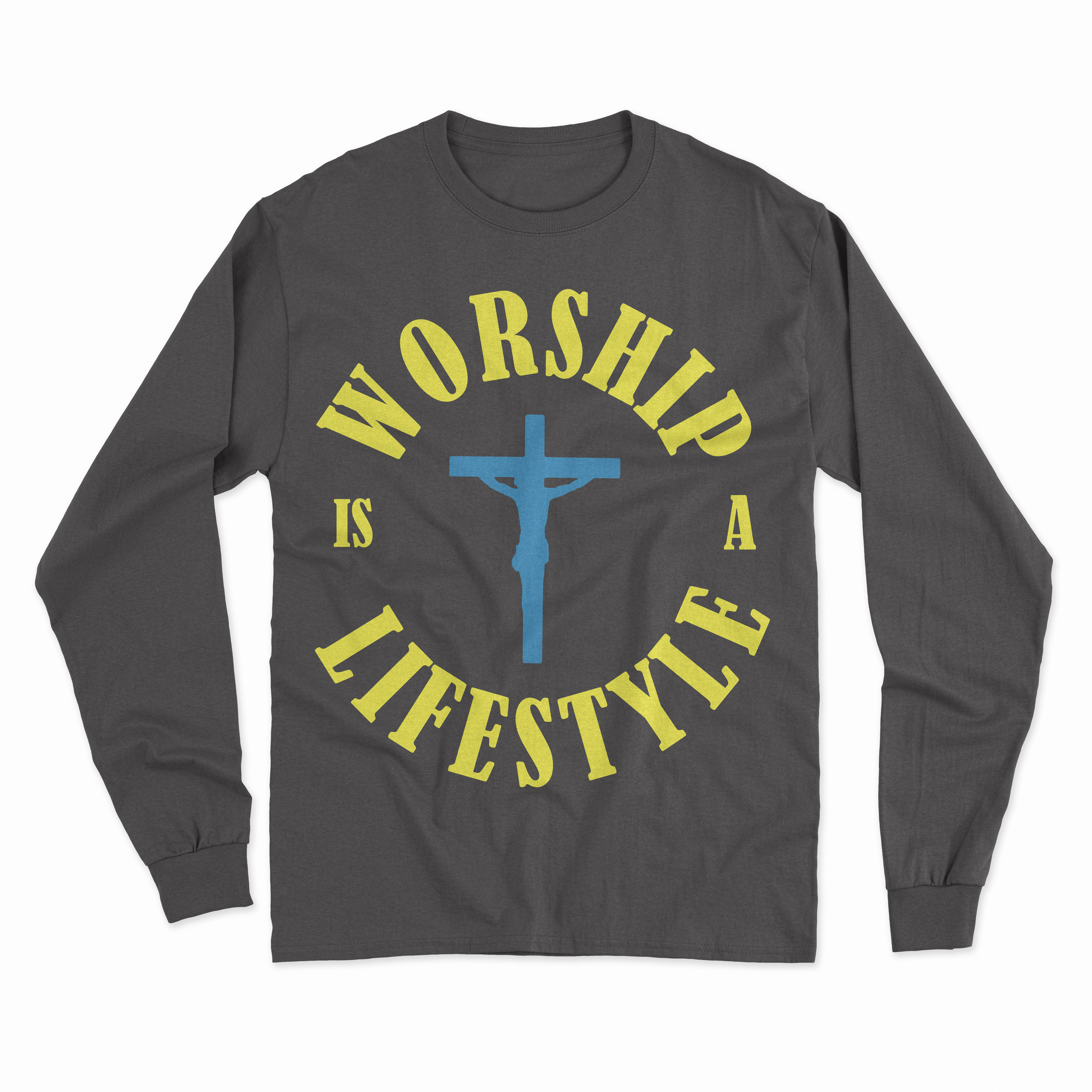50/50 Cotton Poly blend material with a Worship Lifestyle design full front placement, with gold cross apparel logo on the back.